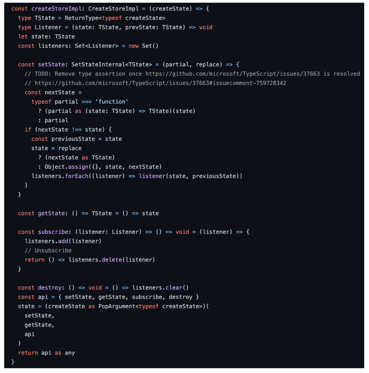 zustand는 발행/구독 모델 기반이다. 리스너 함수를 모아두고 store에 구독을 걸어놓으면(구독) store의 상태가 변경될 때 등록된 리스너들이 발동한다.(발행)