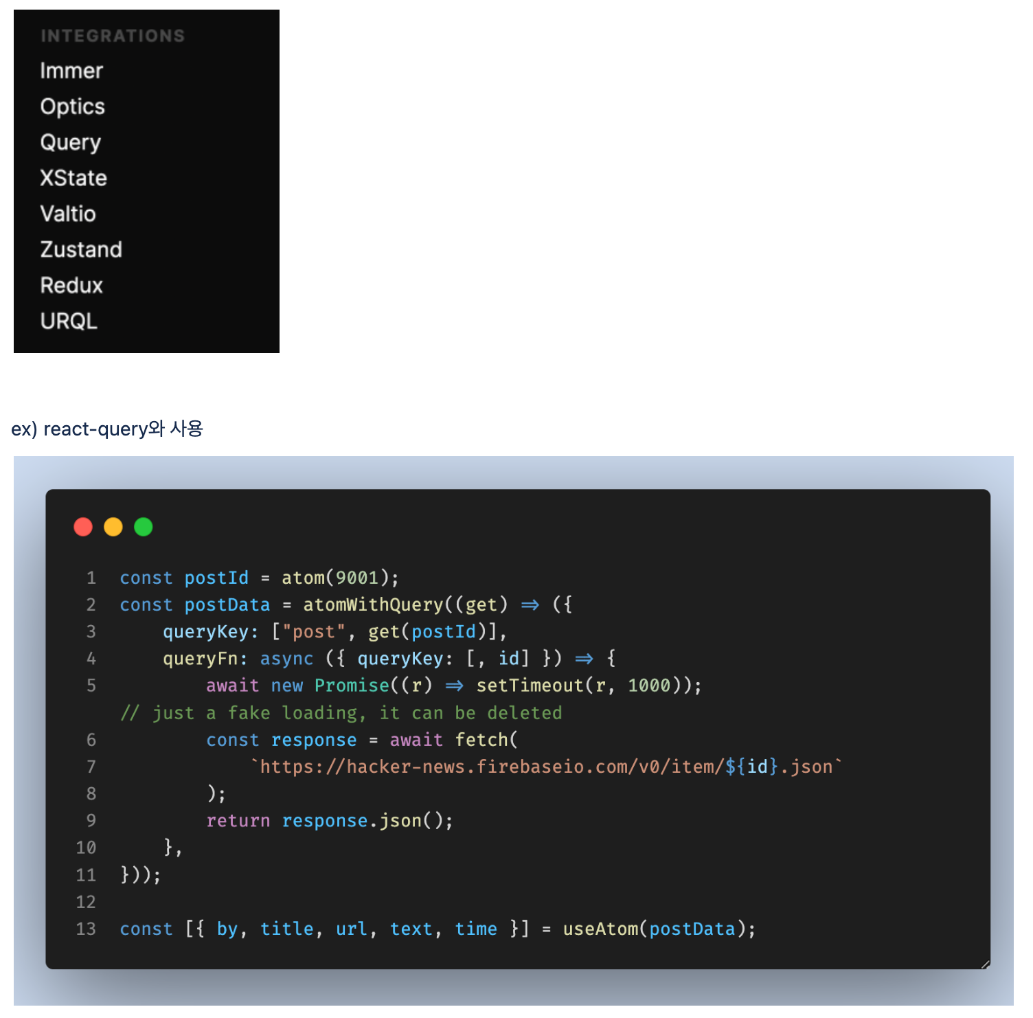 위 라이브러리들은 공통적으로 기존 상태관리(redux, mobx, context api)에 대한 성능 개선과 보일러플레이트 개선을 위해 등장했다.